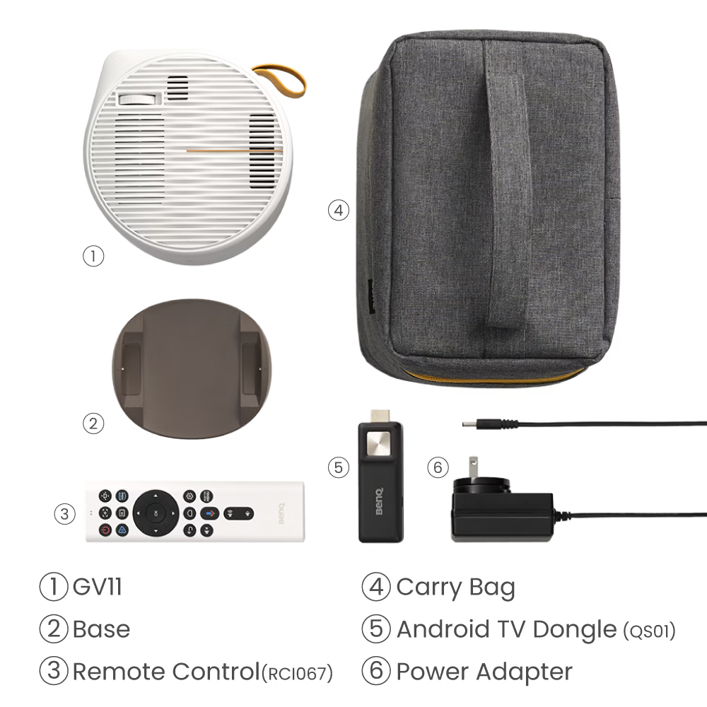 Remote Control with Batteries (x1), Power Cord (x1), Adapter (x1), QS01 Android TV Dongle (x1), Projector Base (x1), Carrying Bag (x1), Quick Start Guide (x1), Regulatory Statement (x1), Warranty Card (x1), Android TV Dongle Installation Guide (x1).
