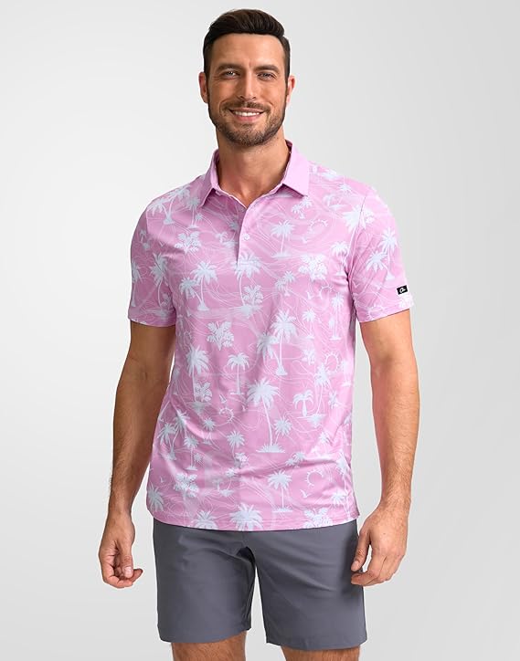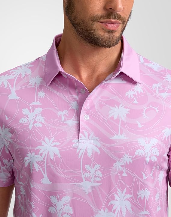 Men's Golf Polo - Short Sleeve, Performance Moisture Wicking - Pink Palms