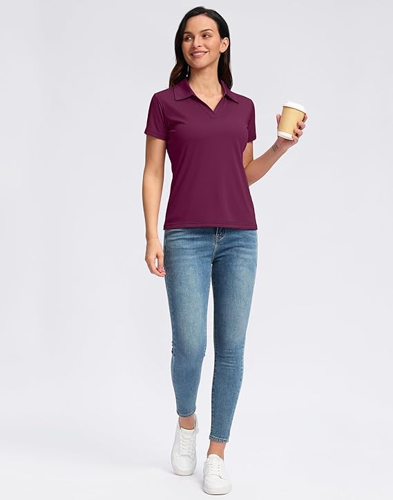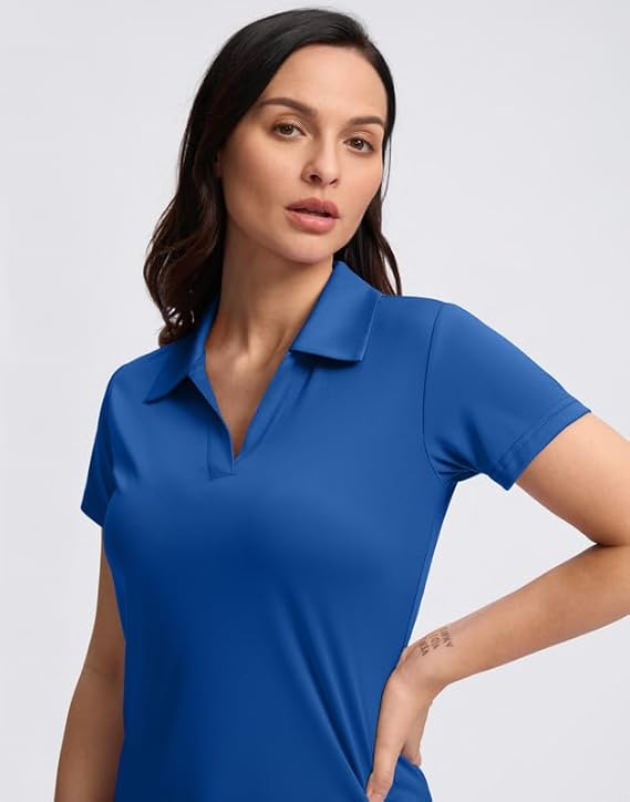 The lightweight, quick-dry fabric wicks away moisture to keep you cool and comfortable, even during long summer rounds. A flattering V-neckline with a tag-free collar reduces chafing while maintaining a chic, sporty look, and the reinforced collar ensures lasting shape.